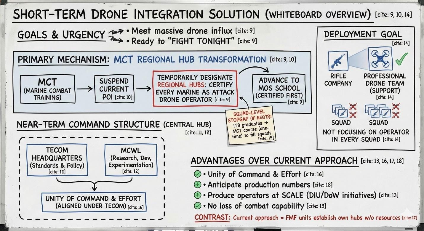 A short-term solution—necessary to meet the massive influx of inbound drones and to be ready to fight tonight—is to temporarily designate MCT regional hubs where every Marine is certified as an attack drone operator before advancing to their MOS school. MCT should suspend its current POI and execute the proposed attack drone operator course.