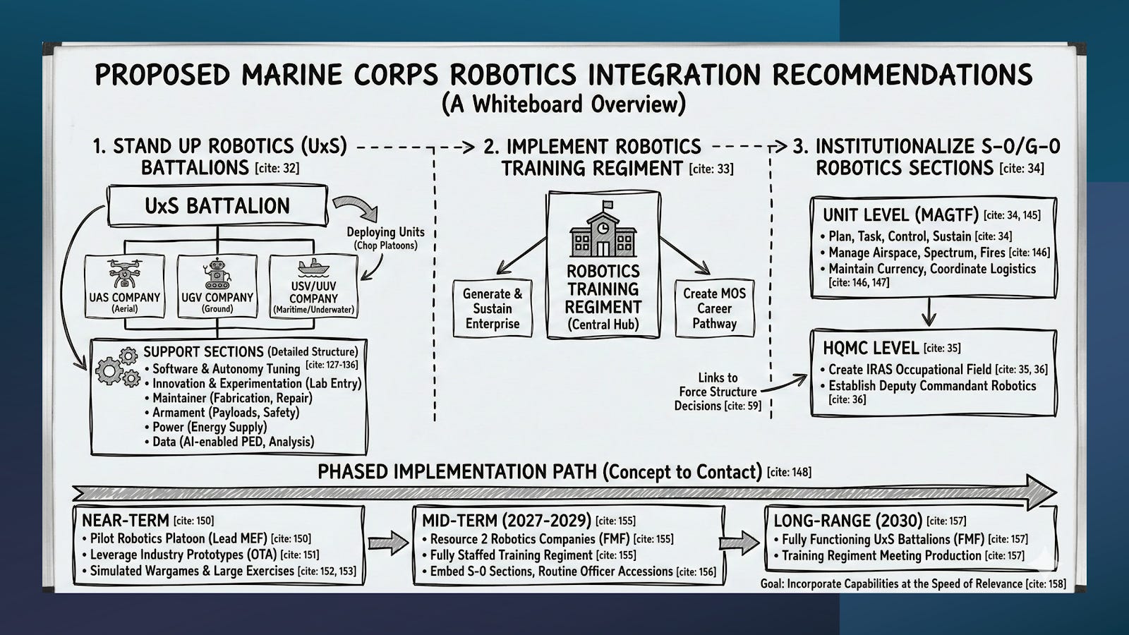 The long-term solution requires the Marine Corps to develop a robotics training regiment where air, ground, and maritime robotic operators are trained to operate uncrewed systems at echelon.